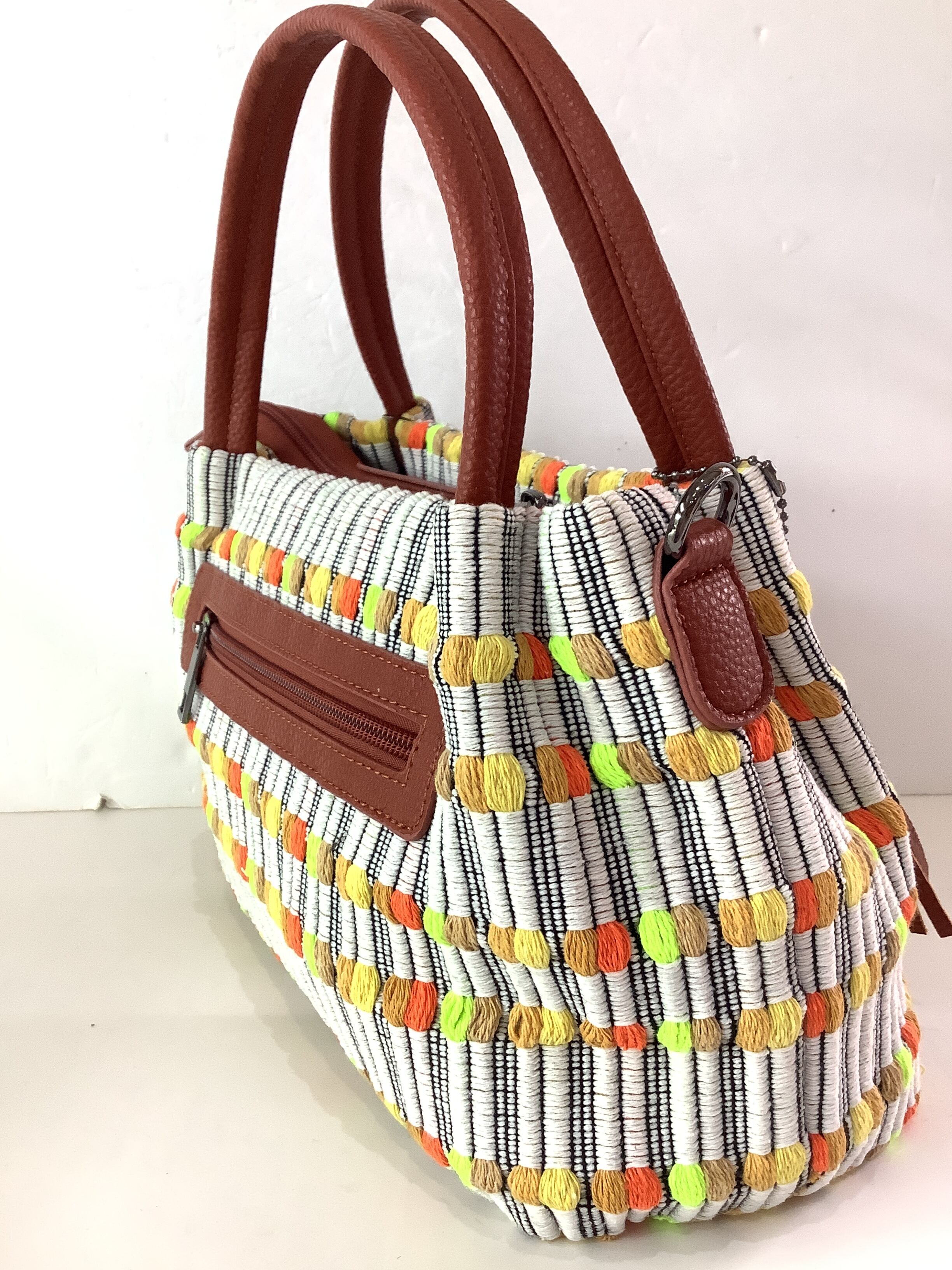 グラデーションカラーで織り込まれた立体感のある生地を本体に使用した2way手提げバック。重量460g